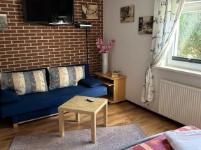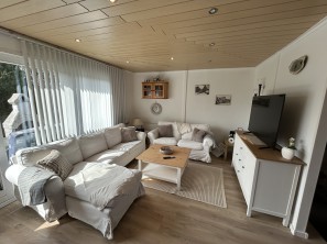 Das Wohnzimmer ist mit einer großen Schlafcouch, Sat TV und einem Flachbild-TV ausgestattet.